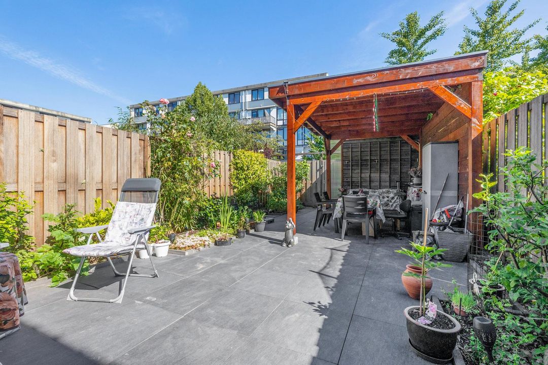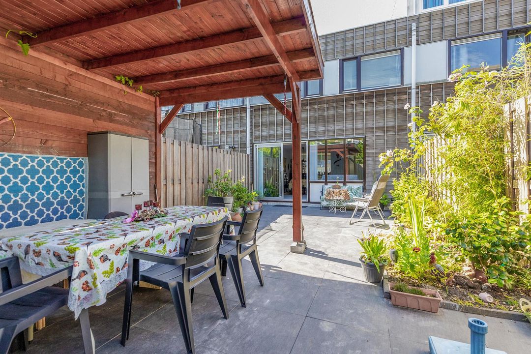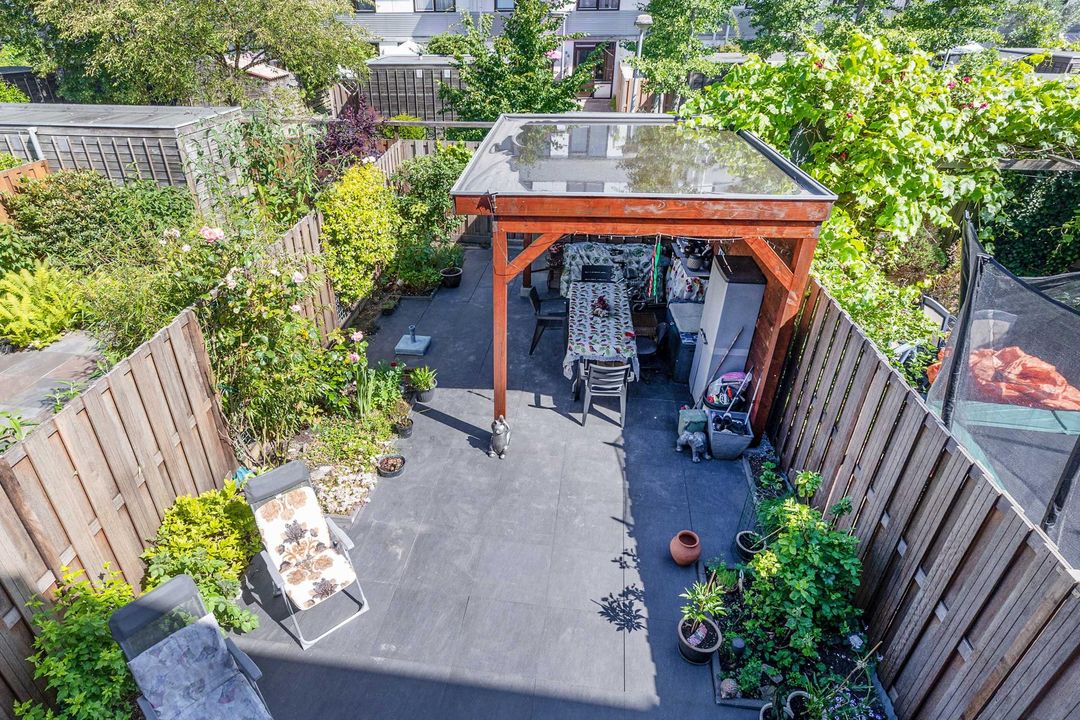 De achtertuin is gelegen op het noorden en heeft een berging met elektra en een praktische overkapping achterin in de tuin. De achtertuin is toegankelijk via een achterom en de woonkamer.